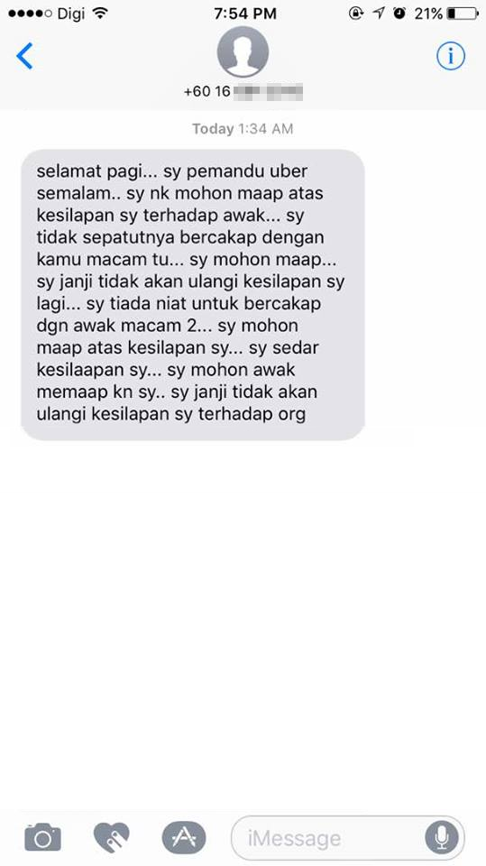 Selepas S keluar dari kereta dan dia jalan balik ke apartment, mujurlah ada beberapa pengawal keselamatan menjaga kawasan di situ. S menerima empat panggilan tidak dijawab dari Uber driver berkenaan dan ada satu mesej darinya yang mengatakan;